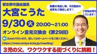 市政 オンライン意見交換会、習志野市の長期ビジョンについて報告します! 毎月行っているオンライン意見交換会、第28回となる今月は、8月26日(火)20時~21時に行います。 今回は、来月の議会で審議・決定される予定である習志野市の長期ビジョンについて主にご報告します。今、「基本構想」という16年間にわたる... 2025.08.18 市政