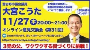 毎月行っているオンライン意見交換会。私の活動の様子や成果を定期的にご報告する場であり、また、参加者の方々から政治や習志野市政についてご意見をいただく貴重な場です。