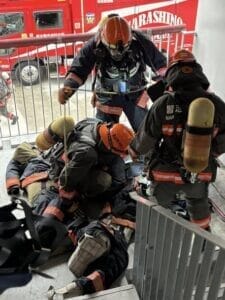 「救難活動隊(Rapid Intervention Team)」とは、火災現場などの危険度が高い活動において、万が一、消防隊員が倒れたり、退避不能となった場合に、救出・支援を行う活動隊のことをいいます。