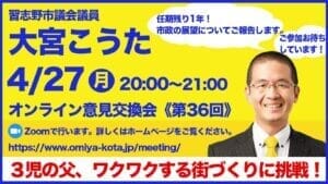 毎月行っているオンライン意見交換会。市議当選後の2023年5月11日の第一回以来、今回で36回目となります。私の活動状況だけでなく、市政の動きや課題等を率直にお伝えして、参加者の方々から様々なご意見をいただき、そのご意見を活動に活かし、その活動の結果をまたオンライン意見交換会でご報告して、、、というサイクルを大事に続けてきました。