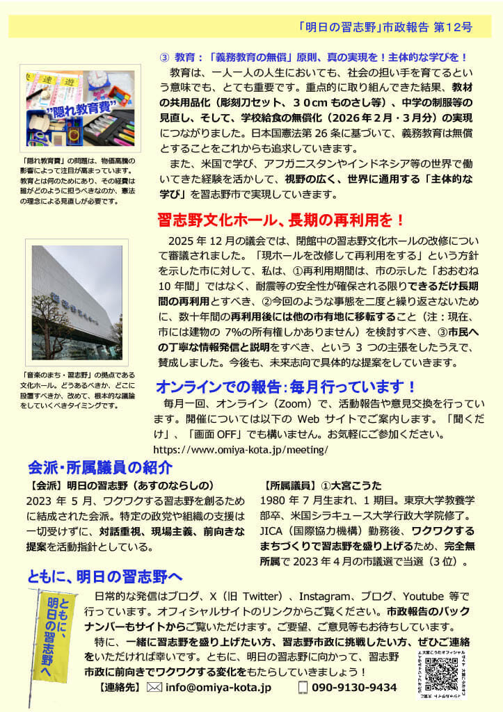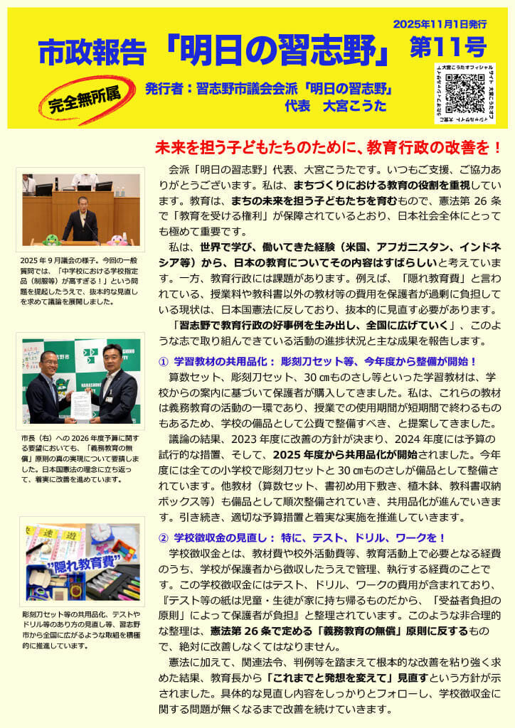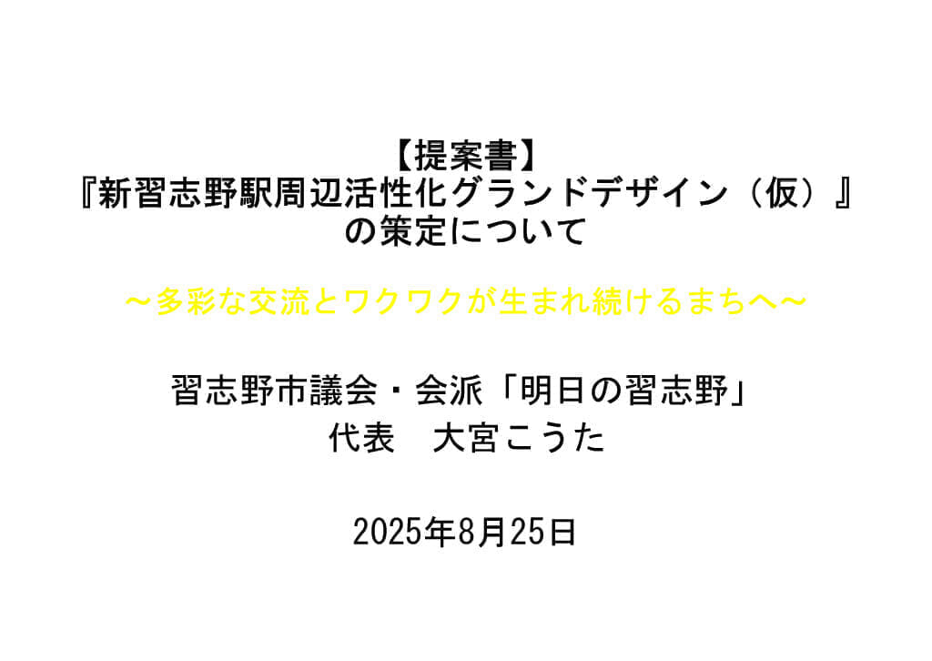 2025年8月、新習志野駅周辺の活性化を推進していくため、会派による提案書を習志野市長に提出しました。提案書の内容は以下からご覧ください。