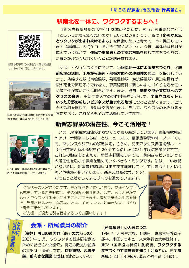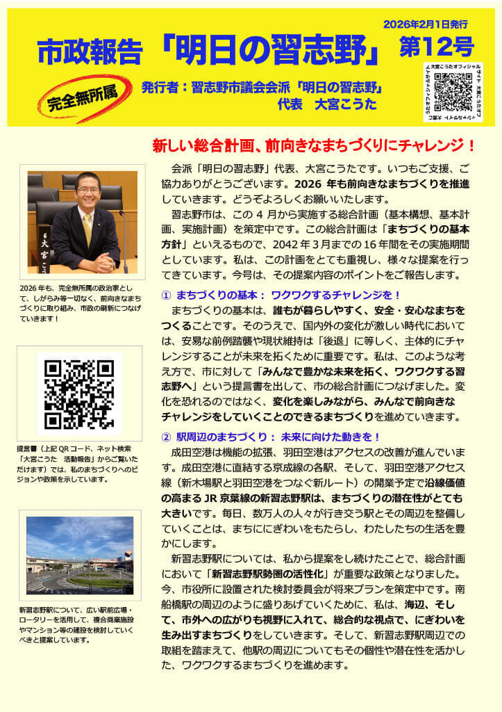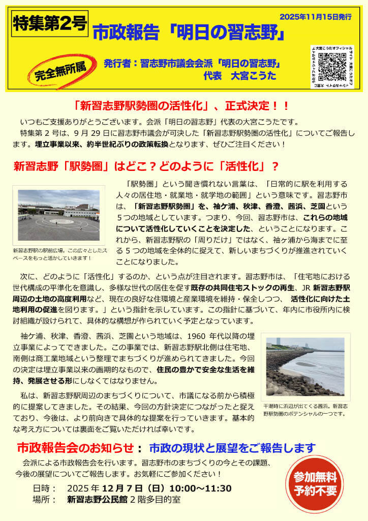 2025年8月、新習志野駅周辺の活性化を推進していくため、会派による提案書を習志野市長に提出しました。提案書の内容は以下からご覧ください。